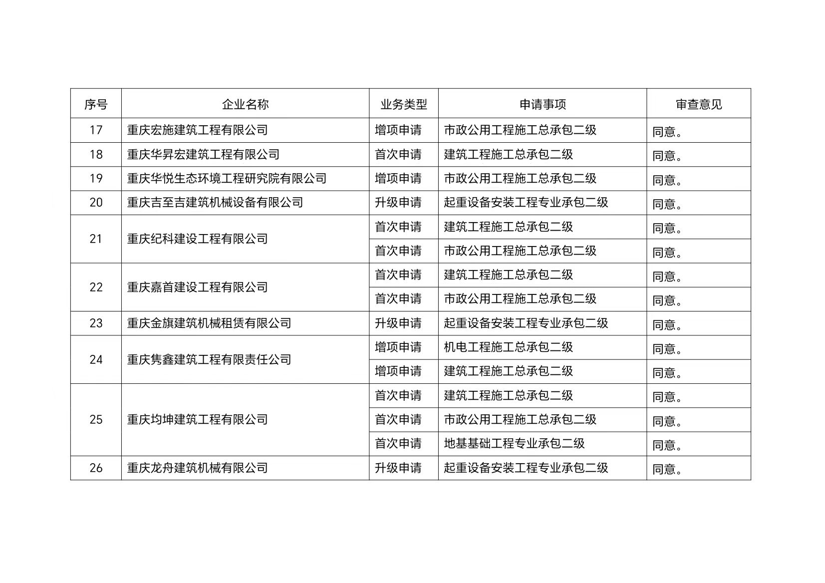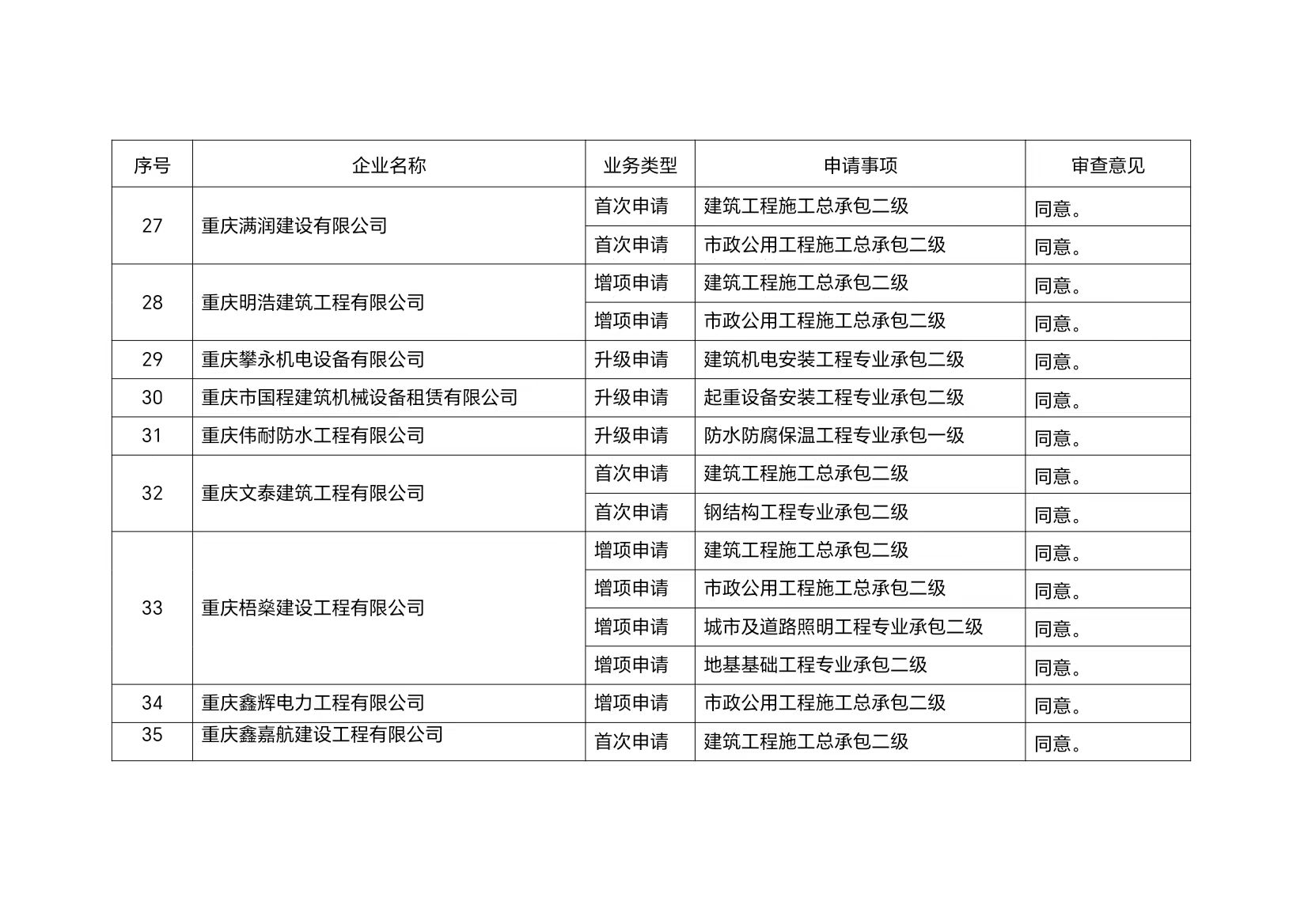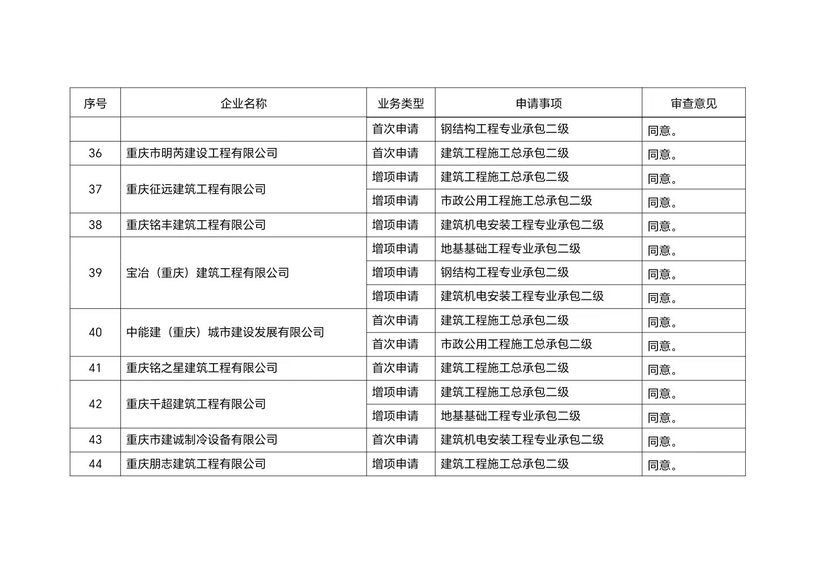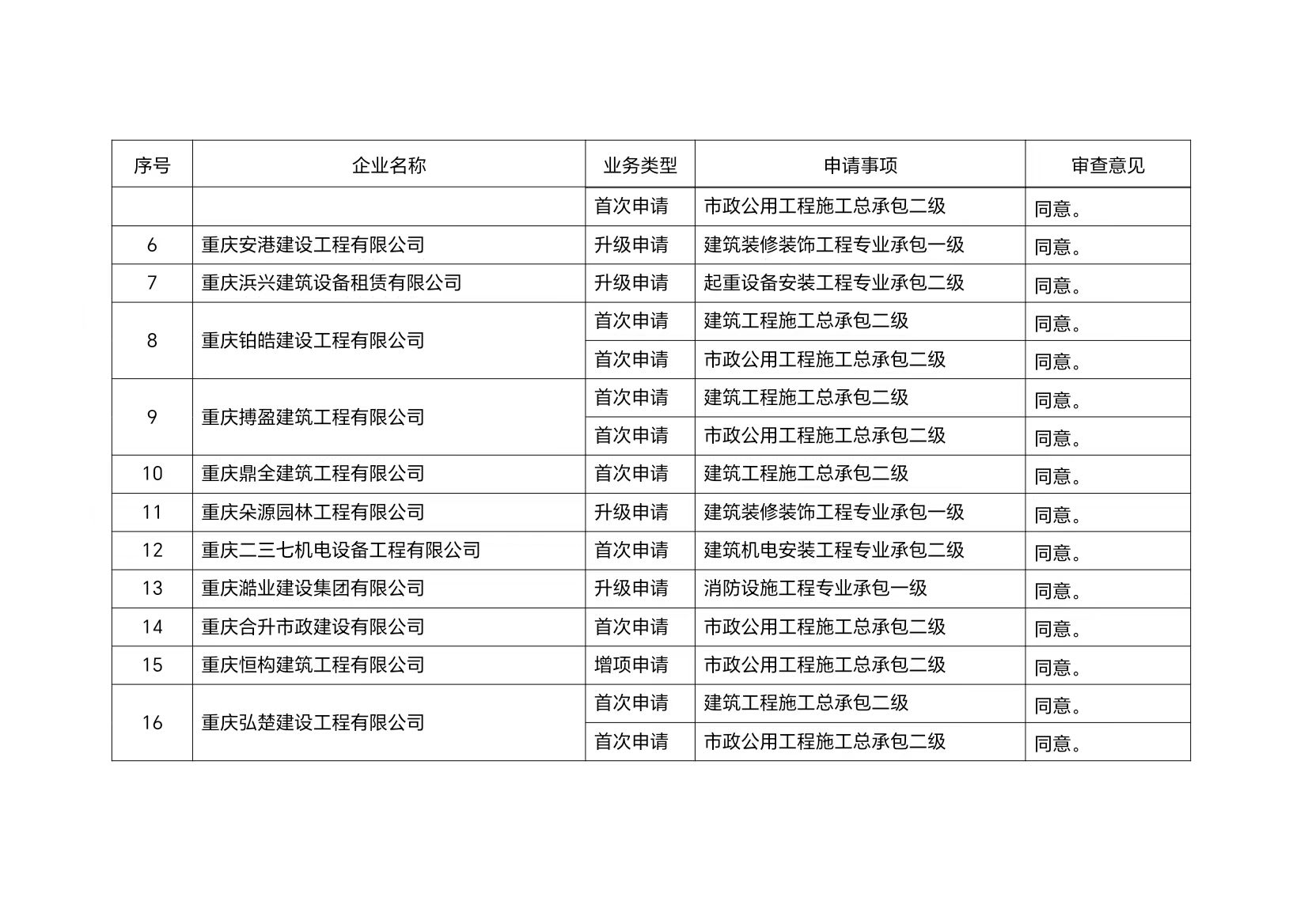 按照《行政许可法》、《建筑业企业资质管理规定》(住建部令第22号)、《建筑业企业资质等级标准》(建市〔2014〕159号)和《建筑业企业资质管理规定和资质标准实施意见》(建市〔2015〕20号)的规定,经企业申报和征求区县住房城乡建委意见,近期审查了宝登(重庆)建筑工程有限公司等企业申请建筑业企业资质的材料,并进行了集体会审,现将审查意见予以公示。