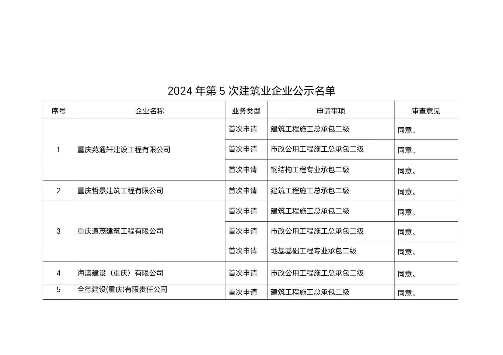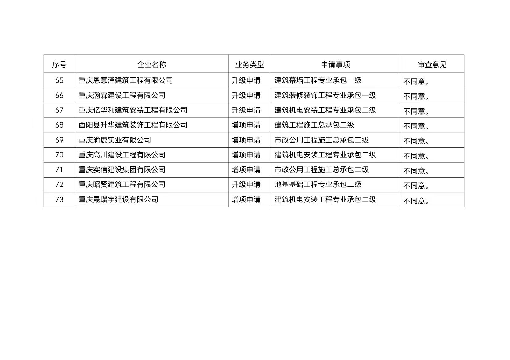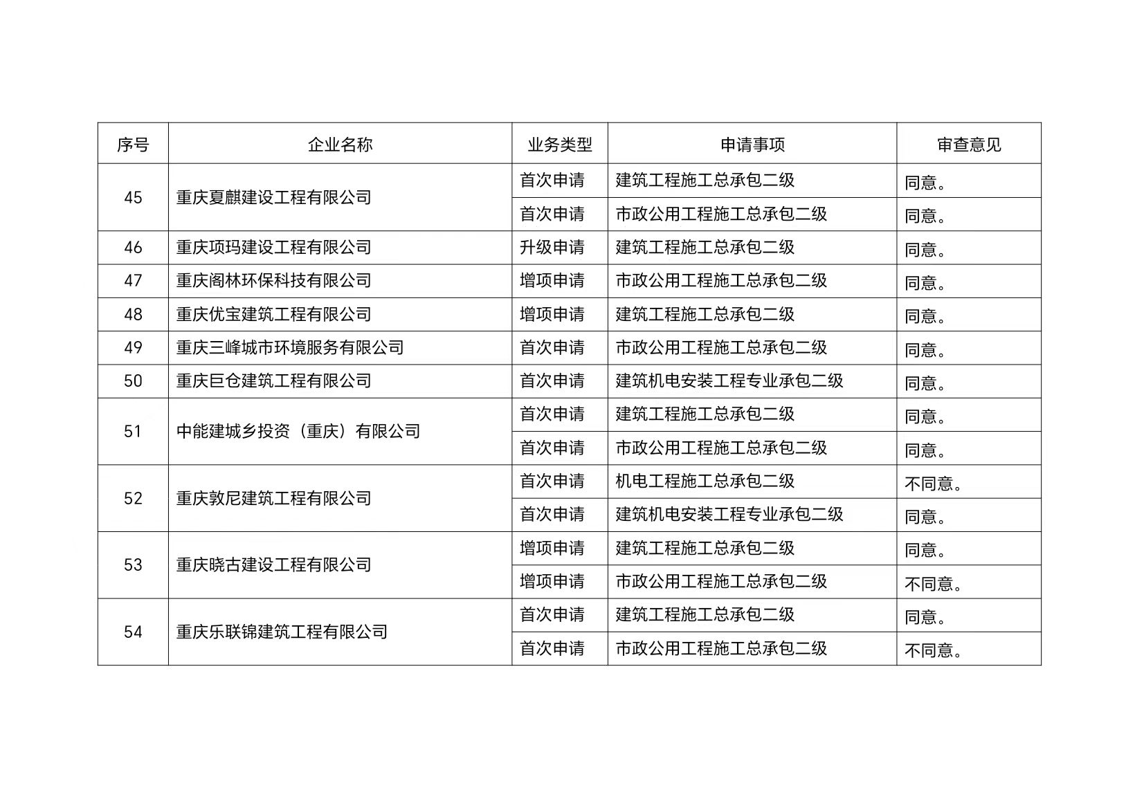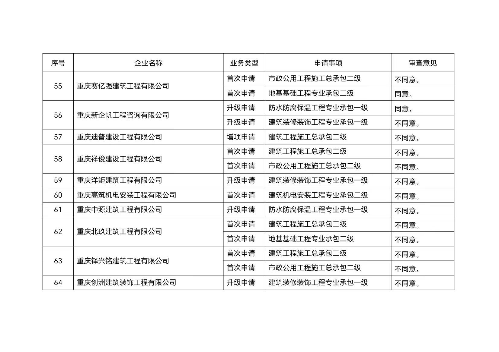 按照《行政许可法》、《建筑业企业资质管理规定》(住建部令第22号)、《建筑业企业资质等级标准》(建市〔2014〕159号)和《建筑业企业资质管理规定和资质标准实施意见》(建市〔2015〕20号)的规定,经企业申报和征求区县住房城乡建委意见,近期审查了宝登(重庆)建筑工程有限公司等企业申请建筑业企业资质的材料,并进行了集体会审,现将审查意见予以公示。