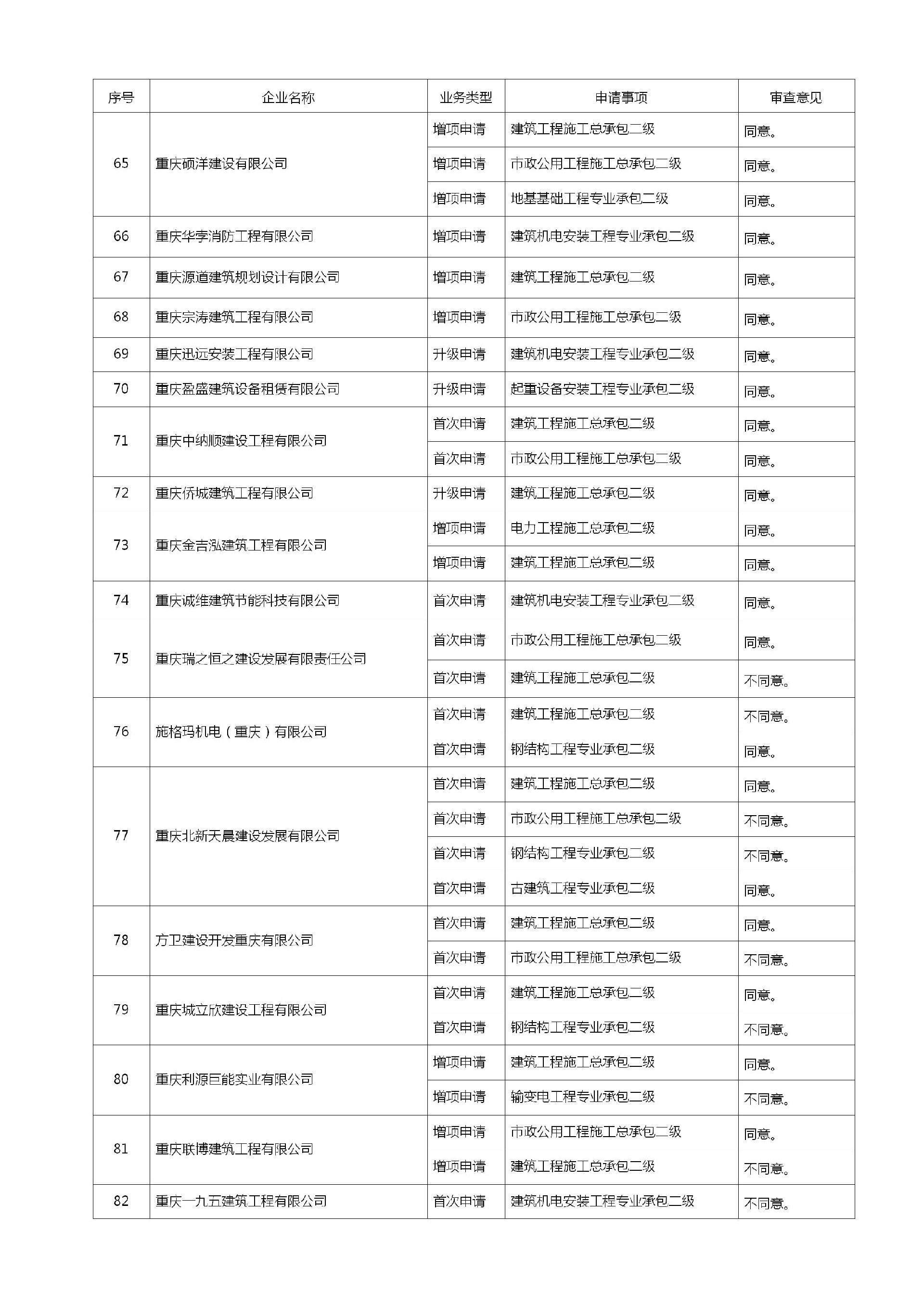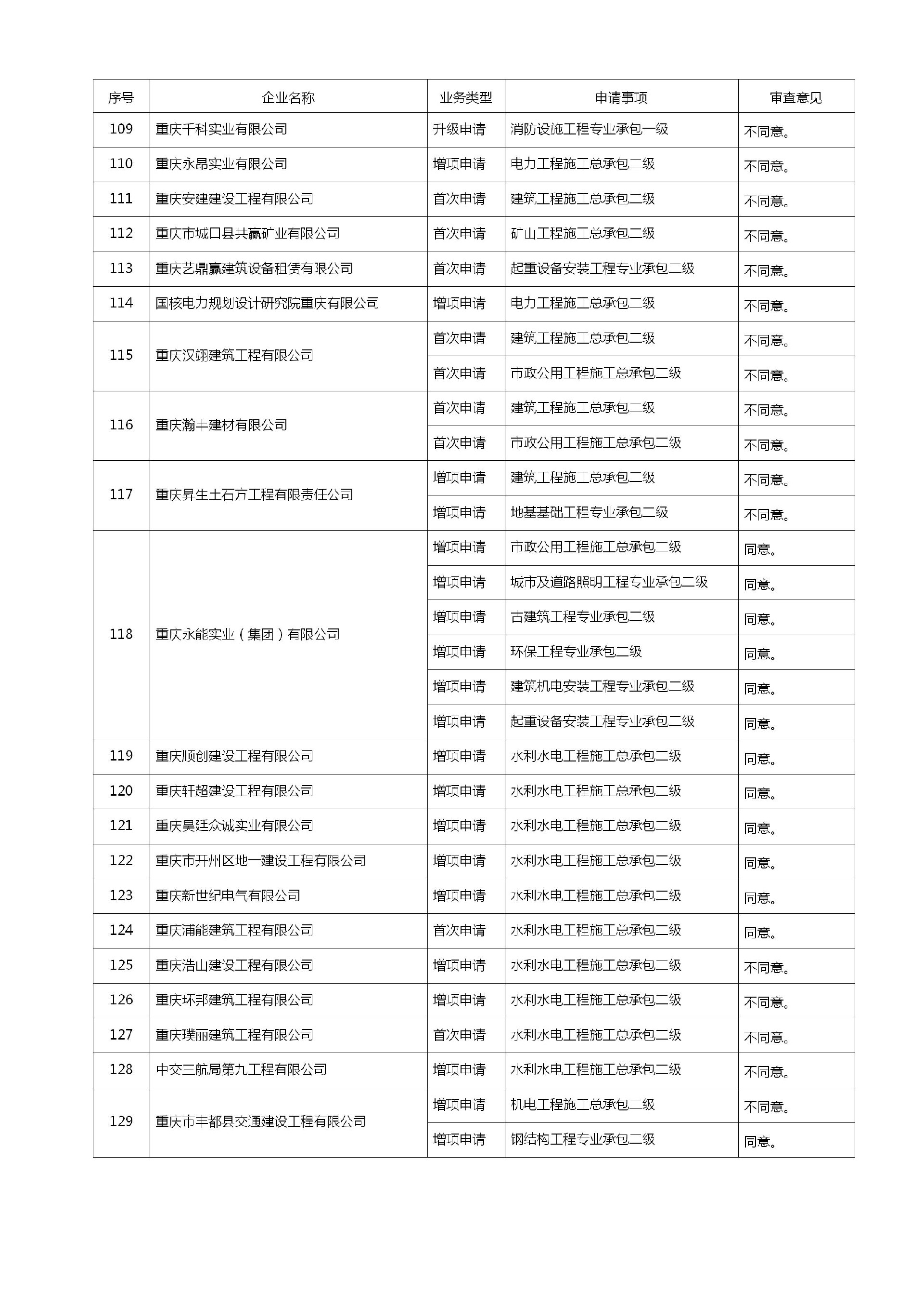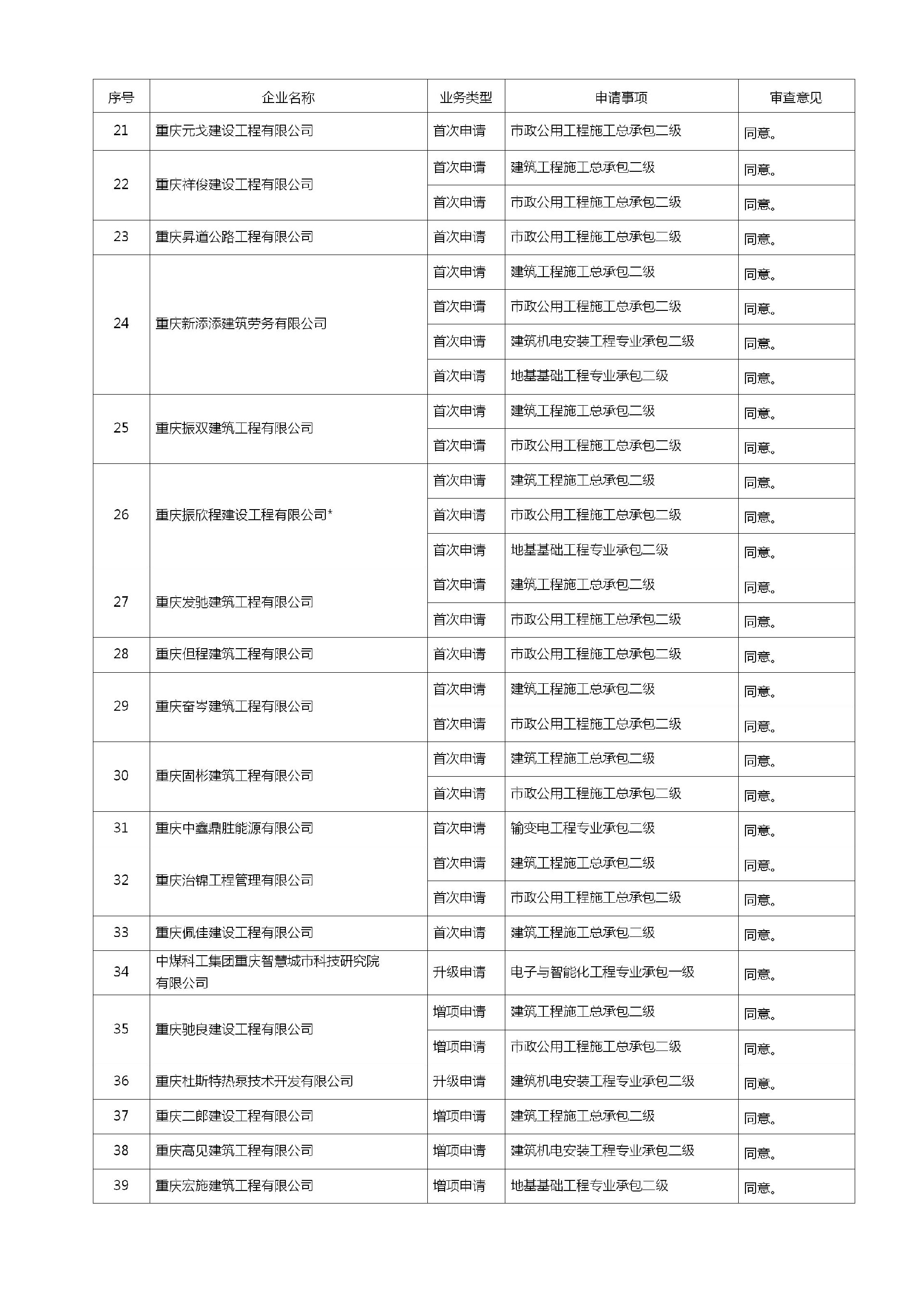 按照《行政许可法》、《建筑业企业资质管理规定》(住建部令第22号)、《建筑业企业资质等级标准》(建市〔2014〕159号)和《建筑业企业资质管理规定和资质标准实施意见》(建市〔2015〕20号)的规定,经企业申报和征求区县住房城乡建委意见,我委近期审查了中州五建(重庆)建设工程有限公司等企业申请建筑业企业资质的材料,并进行了集体会审,现将审查意见予以公示。公示截止日期为2024年6月2日。(审查意见为不同意的企业,自公示之日起2天后可通过“重庆建设工程信息网→网上申报→行政审批服务中心信息管理平台”查询具体意见。)