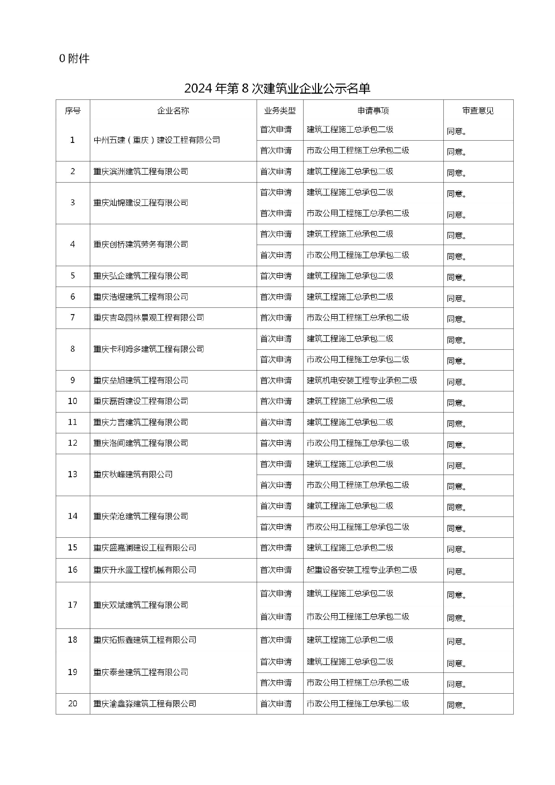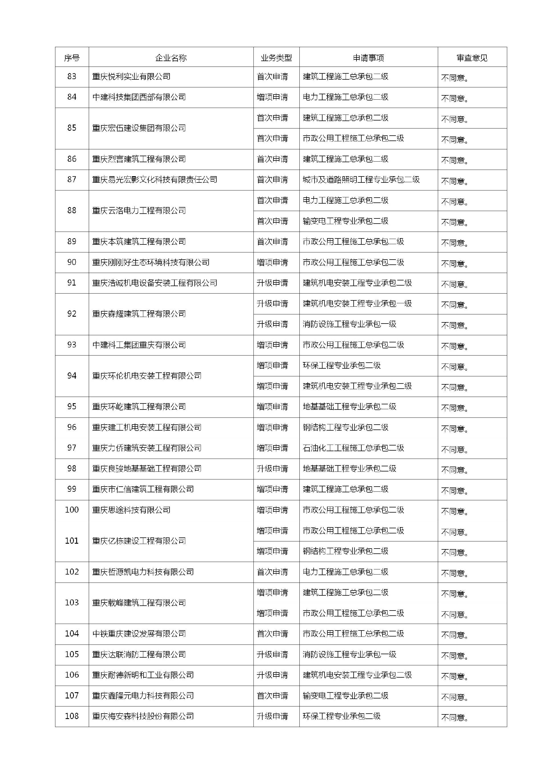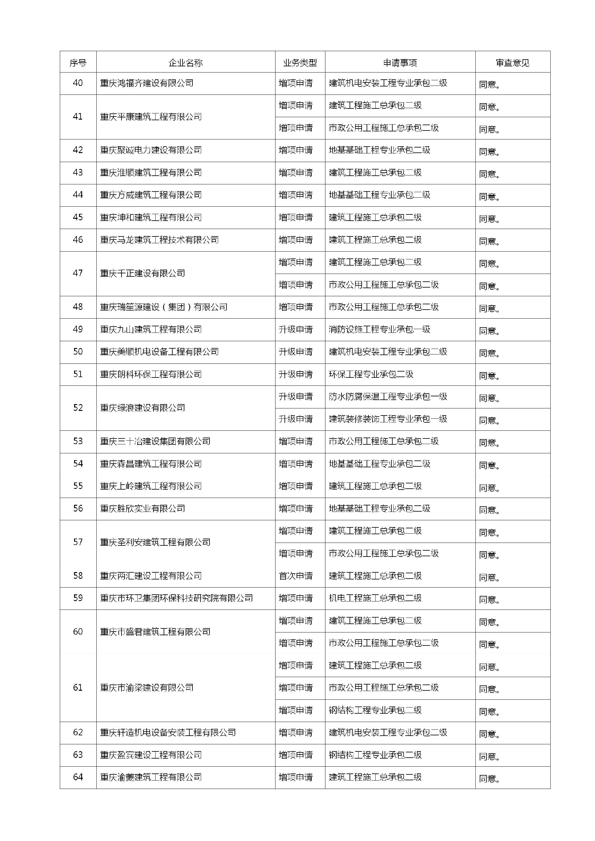 按照《行政许可法》、《建筑业企业资质管理规定》(住建部令第22号)、《建筑业企业资质等级标准》(建市〔2014〕159号)和《建筑业企业资质管理规定和资质标准实施意见》(建市〔2015〕20号)的规定,经企业申报和征求区县住房城乡建委意见,我委近期审查了中州五建(重庆)建设工程有限公司等企业申请建筑业企业资质的材料,并进行了集体会审,现将审查意见予以公示。公示截止日期为2024年6月2日。(审查意见为不同意的企业,自公示之日起2天后可通过“重庆建设工程信息网→网上申报→行政审批服务中心信息管理平台”查询具体意见。)
