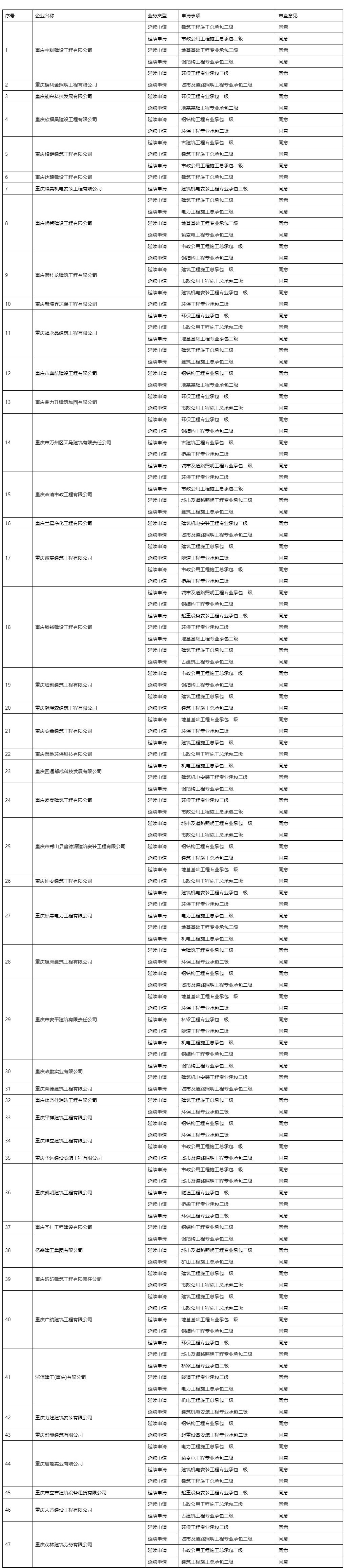 按照《行政许可法》《建筑业企业资质管理规定》(住房城乡建设部令第22号)、《住房城乡建设部关于印发〈建筑业企业资质标准〉的通知》(建市〔2014〕159号)、《住房城乡建设部关于印发〈建筑业企业资质管理规定和资质标准实施意见〉的通知》(建市〔2015〕20号)规定,经企业申报和征求区县住房城乡建设主管部门意见,我委近期审查了重庆宇科建设工程有限公司等企业申请建筑业企业资质的材料,并进行了集体会审,现将审查意见予以公示。公示期为2025年9月22日至2025年10月1日。审查意见为不同意的企业,自公示之日起2天后可通过“重庆建设工程信息网→网上申报→行政审批服务中心信息管理平台”查询具体意见。